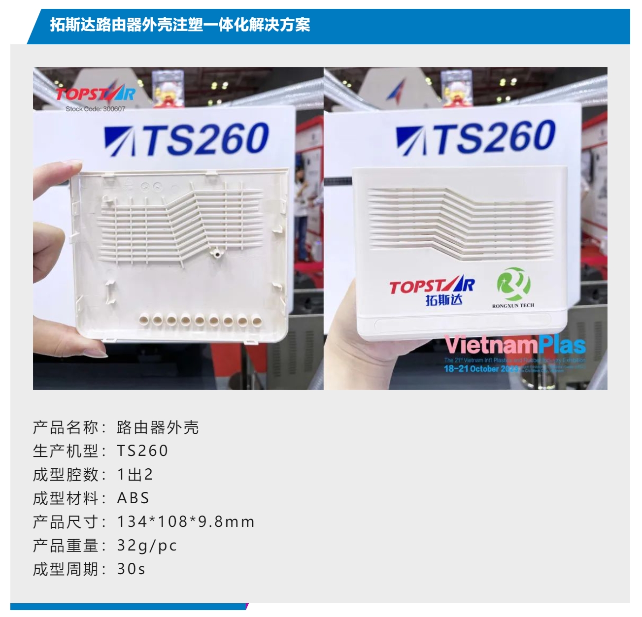 為了向當(dāng)?shù)刂圃炱髽I(yè)提供優(yōu)質(zhì)、穩(wěn)定、高性價(jià)比的產(chǎn)品和服務(wù),展會(huì)中拓斯達(dá)針對(duì)性推出通訊產(chǎn)品路由器外殼注塑一體化解決方案,現(xiàn)場(chǎng)演示生產(chǎn)ABS料、32g/pc的路由器外殼,周期時(shí)間30秒,樣件美觀、尺寸穩(wěn)定。
