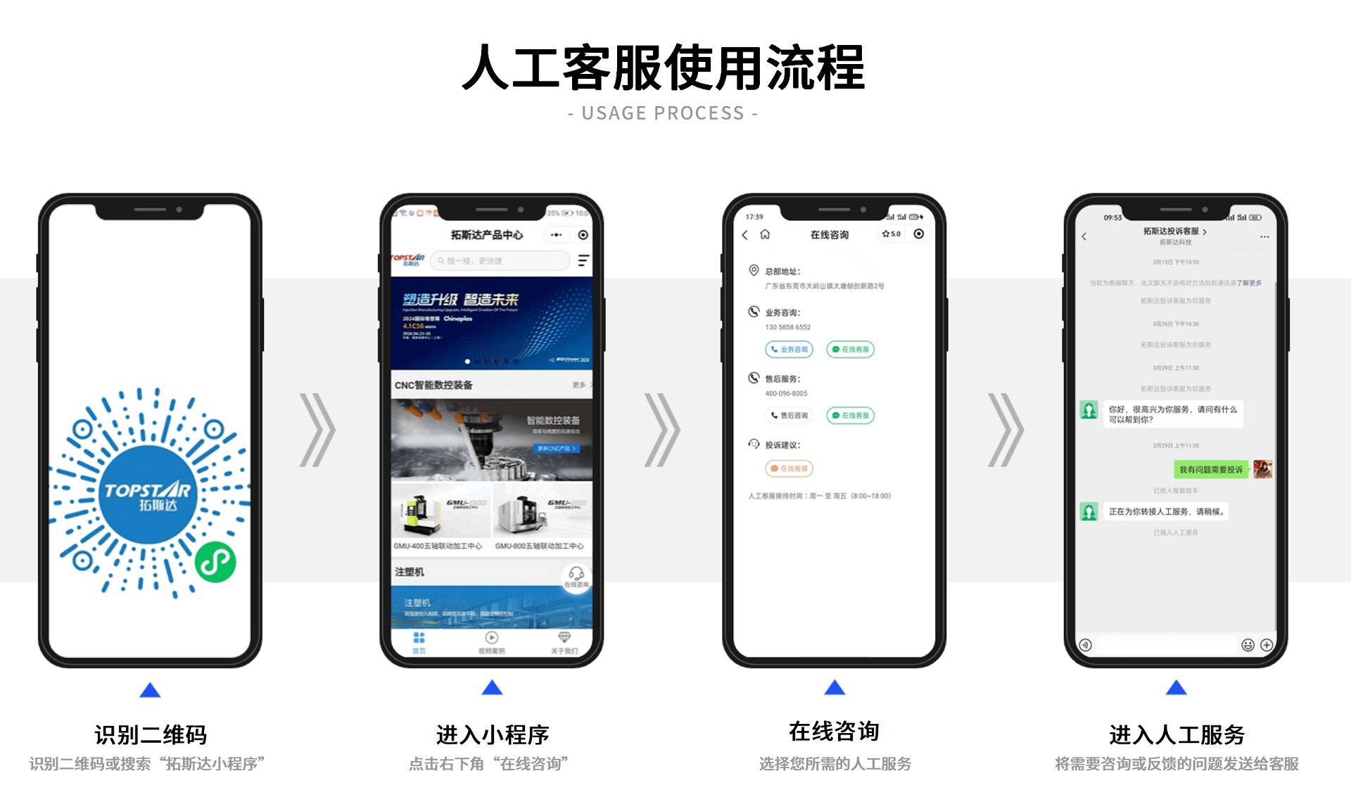 拓斯達始終把客戶的需求和反饋放在首位,為此,我們在小程序設置【在線咨詢】功能,客戶可以直接向企業(yè)反饋在使用產(chǎn)品或服務過程中遇到的問題,讓每位客戶都能輕松地與我們對話。